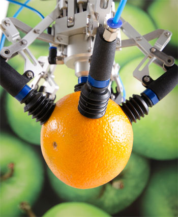 “Our demonstration of the technology has fruit stacked randomly in a bowl – with our robot using machine vision and some smart software to identify which piece of fruit is on top. It translates this information into real-world co-ordinates and positions the ‘hand’ to pick the required fruit, whilst avoiding other objects. The custom-made hand adapts to the shape of the fruit and securely grips it without damaging it. Once picked, the fruit can also be sorted by colour so that, for example, red apples can be separated from green apples.