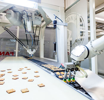 To demonstrate the benefits of robotics within the food industry, FANUC has developed a food grade robot picker cell, combining both an articulated arm food grade robot and a delta style food grade robot. The IP67 certified food picker cell (measuring 4×2.2m and 2.35m tall) is designed to orientate and pack a wide variety of unpackaged and packaged foods, including confectionery, baked, snack and dairy items.