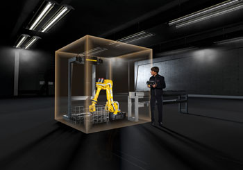 Now, just as when a human intruder penetrates the safety system, the robot in the cell will likewise react if the collaborative robot gets too close.