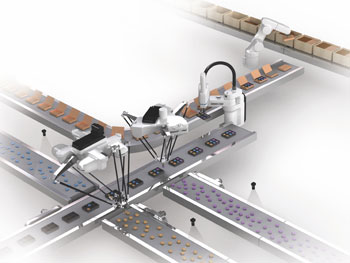 Omron has seamlessly integrated all 49 robots into the machine control environment managed by Omron’s Sysmac automation platform and programming system. Amongst the brightest new stars in the Omron Adept Technologies range is the Quattro s650H Delta (or ‘parallel’) robot. Claimed to be the world’s fastest industrial robot, it is specifically designed for high-speed applications in packaging, manufacturing, assembly and material handling. It is the only parallel robot in the world that features a patented four-arm design (rather than the usual three), advanced control algorithms, and large working envelope. This makes it an ideal, overhead-mounted robot for smooth motion, high-throughput applications.