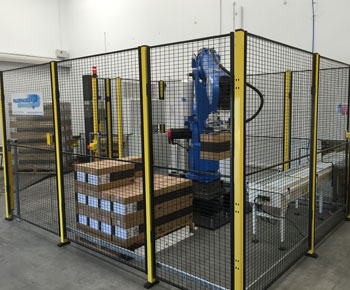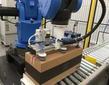 Cases from the high care area enter the cell on a powered roller conveyor and are presented to the robot narrow edge leading. The floor mounted six-axis FANUC S420 articulated robot arm picks the cardboard boxes and places them, in configuration, on the pallet, using a multi-cup vacuum gripper. Once full, the pallet is removed from the cell on a motorised pallet truck, and an operator puts a new pallet in its place.