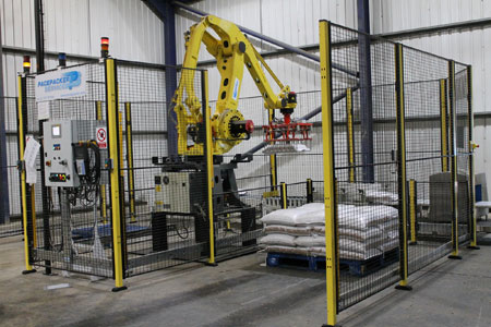 The M410iC/185, which was installed in February this year, has increased palletising speed to 10 bags per minute, and has enabled the company to reduce the working week from six days to five without laying anyone off – staff have been redeployed to less physical tasks. Chris also reports that bags are now stacked more consistently onto pallets allowing for much “safer storage within our warehouse and easier loading into containers”