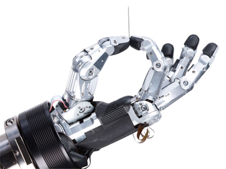 The SCHUNK SVH 5-finger hand grips nearly as perfectly as the human hand. The electronics are completely integrated into the wrist and this allows the SCHUNK SVH 5-finger hand to simulate nearly all human hand movements. Incorporating a total of nine drives, various gripping operations and movements can be executed with high sensitivity. The elastic gripping surfaces ensure a reliable grip on all types of objects. The SCHUNK SVH can be connected to industry-standard robots and lightweight robots via defined mechanical interfaces. This impressive hand was particularly busy at the exhibition greeting stand visitors with countless handshakes and gestures.
