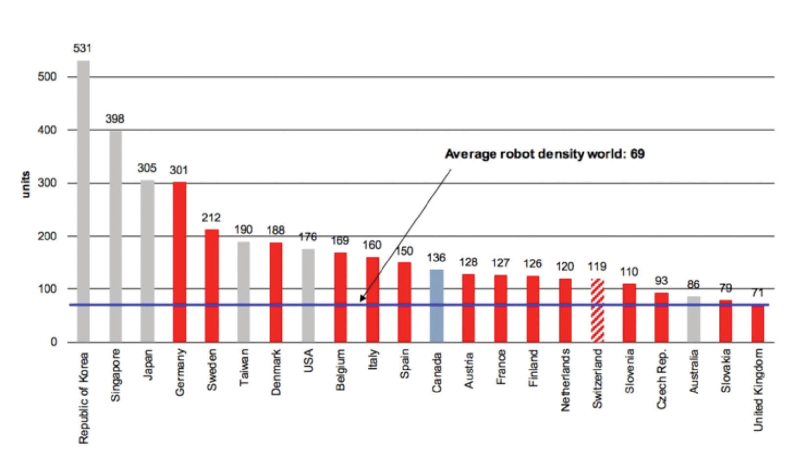 The overall robot density in the large Western European economies is still currently ahead of China, who have 49 robots per 10,000 employees, but the robot population there continues to grow fast, boosted by the government’s aim to become one of the top technological nations. Their stated aim is to hit 150 robots per 10,000 employees by 2020. This is against the background that China’s economy was built up on the basis of low wages.