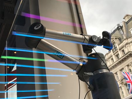 Two Universal Robots UR10 articulated arms are capturing the attention of those passing the display window of a prestigious new store in London’s West End. Global sportswear giant ASICS has recently opened its flagship European retail premises on Regent Street, where front-of-house UR10 robots – supplied and commissioned by RARUK Automation – are engaging shoppers with eye-catching routines that include producing drawings of trainers on the store’s impressive front glazing.