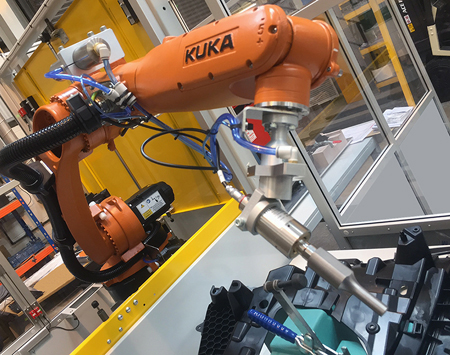 The new automated ultrasonic welding production system recently installed uses a Kuka 6- axis robot, which operates between dual workstations with intelligent workpiece fixturing, allowing different component part types to be processed while simultaneously loading / unloading. Directly mounted to the robot wrist is the Telsonic converter and sonotrode arrangement, powered by a Telsonic 35kHz MAG3512E generator system.