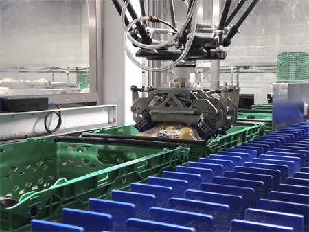 180413_BrillopakSome progress has been made in this space; Brillopak’s R&D has yielded a patent-pending end-effector with a hand-like form, designed to delicately scoop up and place products. The team calls it the ‘Glove’. The reason is the tool uses an action like a closing hand or flower to gently pick and release items with precision and control. Designed initially for a produce industry customer who wanted the flexibility to change the number of potatoes in a bag without impacting line speed, the ‘Glove’ overcomes the issue of complex reprogramming. That’s because it can pick up each potato pack individually rather than relying on collation. In the line of the future, this end-effector technology could be deployed to handle items like the sugar-pod.