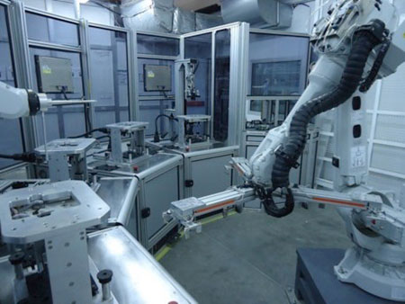 After considering the challenge, the first step was to determine an efficient way to reduce handling time and deliver better accuracy while positioning products into test fixtures. Simulations concluded that a robotic cell configuration with a central robot for handling products and an additional smaller robot for performing functional test would work well.