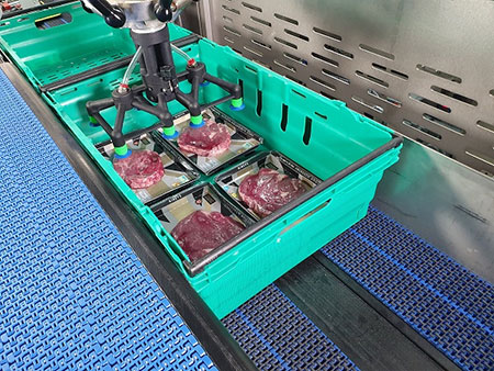 By optimising the cycle speed and developing a new range of end effectors, a single robot with a dual-pick head, Brillopak has shaved 25% off the cost of a typical robotic crate packing system. In this configuration, the robot performs two picks, then places the packs in the crate, two at a time. It becomes a cost-effective and space-efficient machine capable of packing tray sealed meat packs in excess of 70 packs per minute.