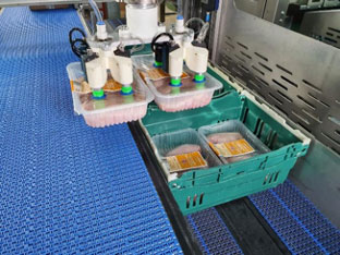 Accurate feeding into the robot cell is key to an efficient crate packing operation, and in meat, fish and poultry applications, different tray orientations can cause a problem. Whilst some trays will exit the tray sealer narrow-edge leading, others will be long-edge leading, depending on the tooling format. A robot can pick packs in either orientation, but to maximise picking efficiency, all packs should normally be presented in the same orientation. Brillopak has addressed this potential issue with the design of a servo turner that will reposition trays after they leave the tray sealer.