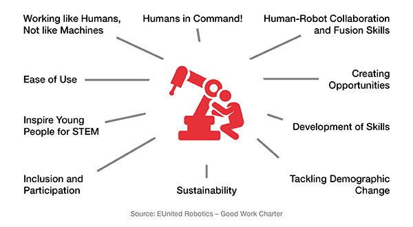 “2.7 million industrial robots in use worldwide and the increasing use of service robots outside factories rapidly change the way we work,” says EUnited Robotics Chairman, Wilfried Eberhardt. “To actively manage this transition, the European robotics industry has developed the ´Good Work Charter´ and identified 10 focus areas that we need to address now. It is essential to understand that humans will always play a central role in the workplace.”