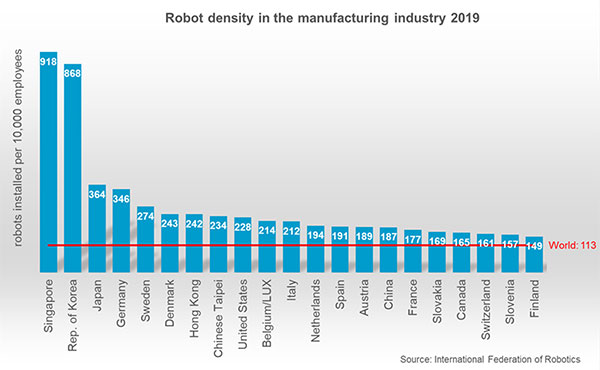 “Robot density is the number of operational industrial robots relative to the number of workers,” says Milton Guerry, President of the International Federation of Robotics. “This level measurement allows comparisons of countries with different economic sizes in the dynamic automation race over time.”