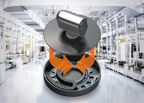 For cameras, robots or handling systems with rotary movements to be able to carry out their work 24/7, the cables must be well protected. In addition to slip rings, rotary energy guides are often used to move cables and hoses safely when rotating through 360 degrees. “In our previous rotary modules, the chain always lay down in a steel channel,” says Justin Leonard e-chain director at Igus UK. “The channel or trough was often complex and costly, which was not attractive for users of smaller applications in particular.”