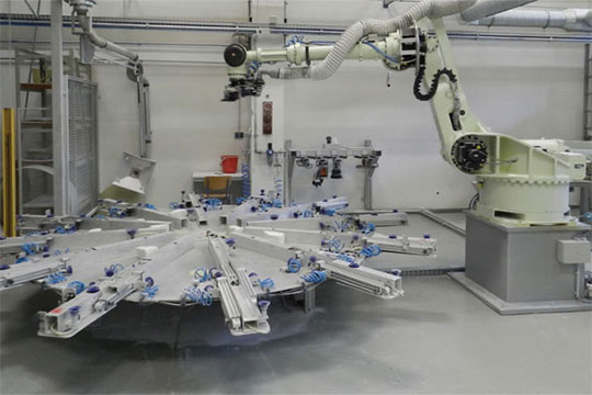 Haase installed the Kawasaki ZT130S robot to spray glass fibre reinforced plastic (GRP) onto the double-walled cellar and underground storage tanks during the finishing process. The robot is shelf-mounted next to a turntable where the parts are fixed, making it easy to apply an even coat of GRP.