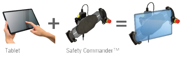 Tablets are more and more often used as control terminals at manufacturing sites. According to ISO/IEC safety standards, tablets need to be equipped with safety devices when used near sources of danger from machinery. That’s why safety features like enabling switch and emergency-stop switch are built-in to the Idec HT3P Safety Commander. You are then able to shut down the machinery from any tablet.