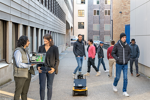 250311_TUMResearchers at the Technical University of Munich (TUM) have developed a wheeled robot that makes its way through a crowd of people safely and without hesitation. A computer on board predicts the movement of people in the vicinity and how they are likely to react to the robot. From this, it calculates the fastest route. Similar algorithms could also be used for humanoid robots or autonomous driving to enable safe interaction between robots and humans.