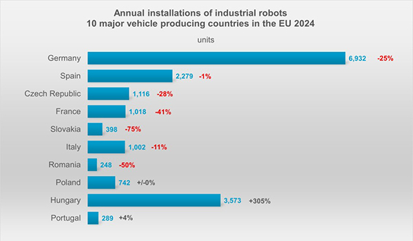 The EU’s other top 10 automotive countries cut robot investments in 2024 are: Spain as the second largest vehicle producer, installing 2,279 units in 2024, which is a decrease of 1%. The Czech Republic in third place with 1,116 units, down 28%. France in fourth place with 1,018 units, showing a 41% decrease. Slovakia on five installing 398 units, which is a 75% decrease. Italy on six, with 1,002 units and an 11% decline. Romania on seven has 248 units, down 50%.