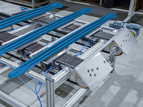 After granulation, the robot places the side impact beams on another conveyor system from mk: a ZRF-P 2040 dual-lane timing belt conveyor, 5,600 mm long and 500 mm wide, with customer-supplied workpiece holders on the top side of the timing belt. The solution boasts one special feature – at the end of the conveying path, mk has fitted a compact GUF-P Mini belt conveyor between the two lines, 400 mm long and 200 mm wide. The cross conveyor lifts the side impact beams with a pneumatic lifting device and transfers them to a belt conveyor provided by the customer. This realises the 90 degree corner transfer.